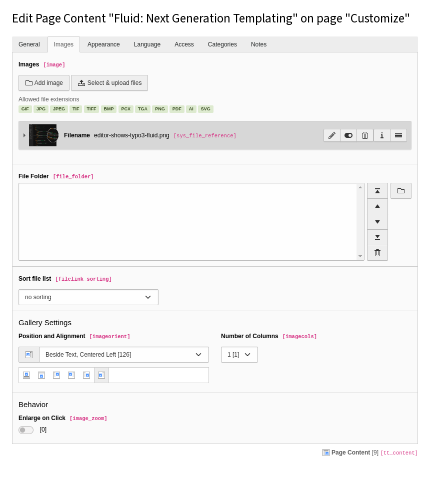 Multiple images and movies are combined as a gallery, which can be configured using the Gallery Settings. In some installations there are specific settings for width or height for each element, if a border should be shown around each element, the position of the gallery in relation to the text and the amount of columns which should be used for the gallery.