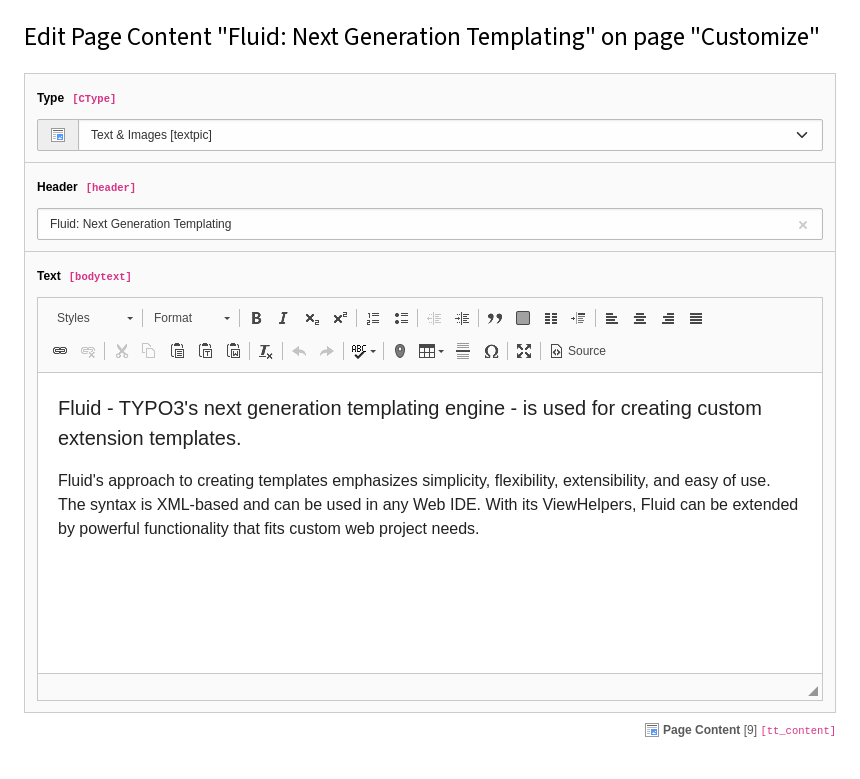 The content element rich text editor in the content element Text