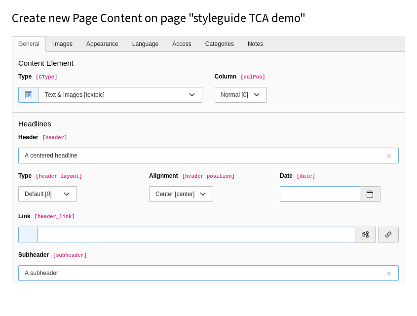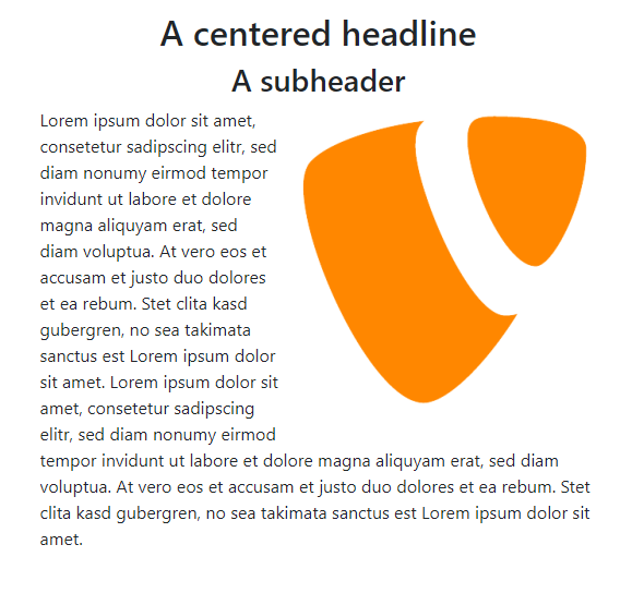 For example, if you create a content element of type Text with Images with a centered headline, a subheader, some text and an image with the position in text, right: