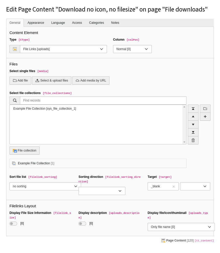 - In this dropdown you can select if you only want to show the file name, the file name and a corresponding icon, based on the file extension, or the file name with a thumbnail, if it is possible for TYPO3 CMS to generate a thumbnail from the file.