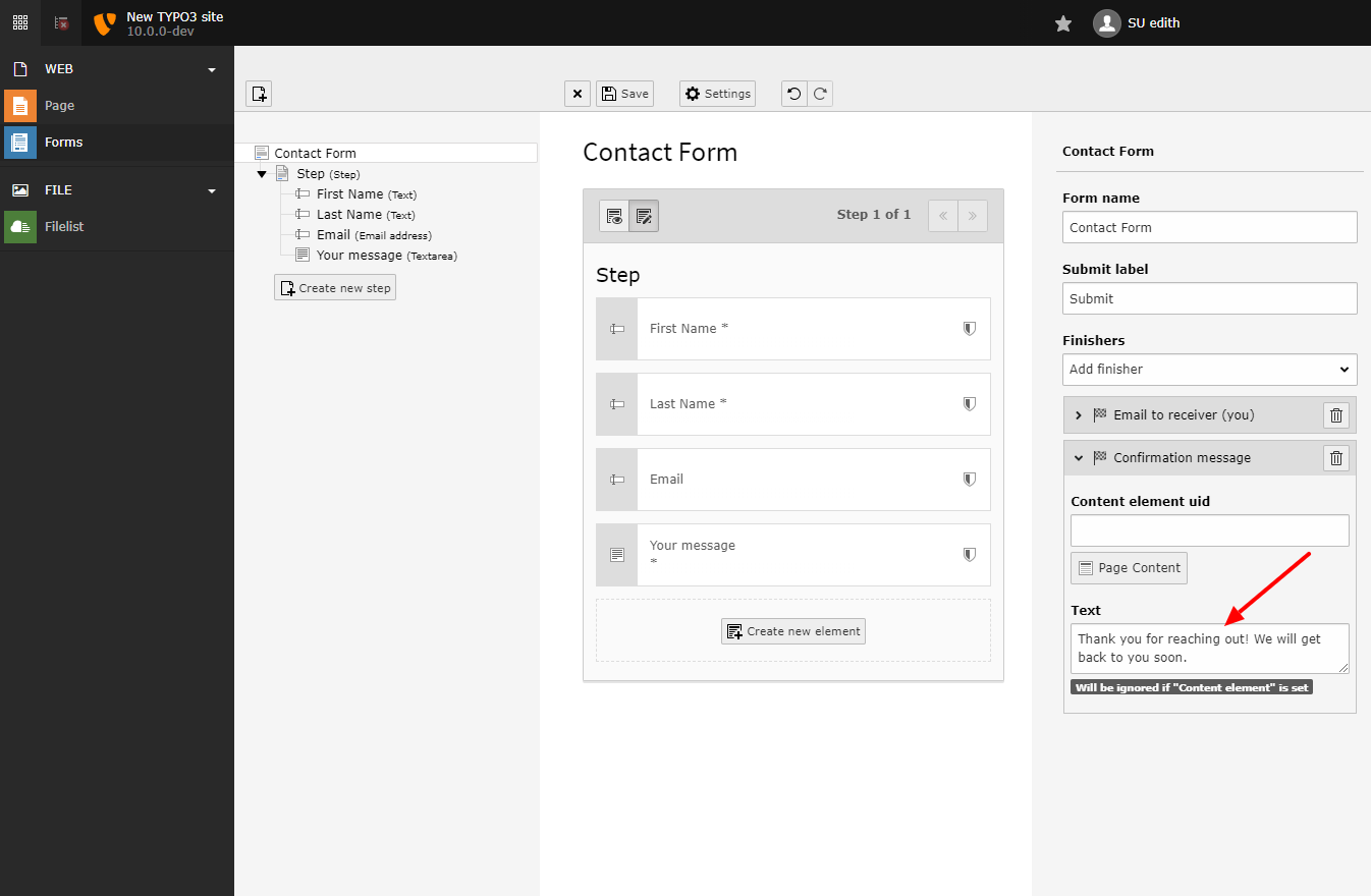 After the user submitted the form we want to display a confirmation/ thank you message. To do that, choose the "Confirmation message" finisher.