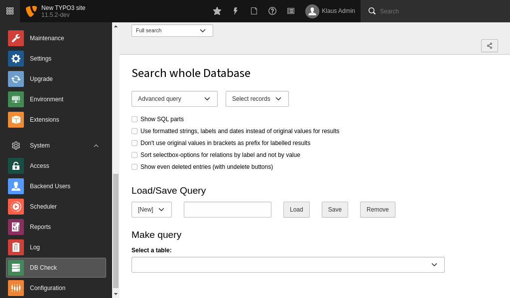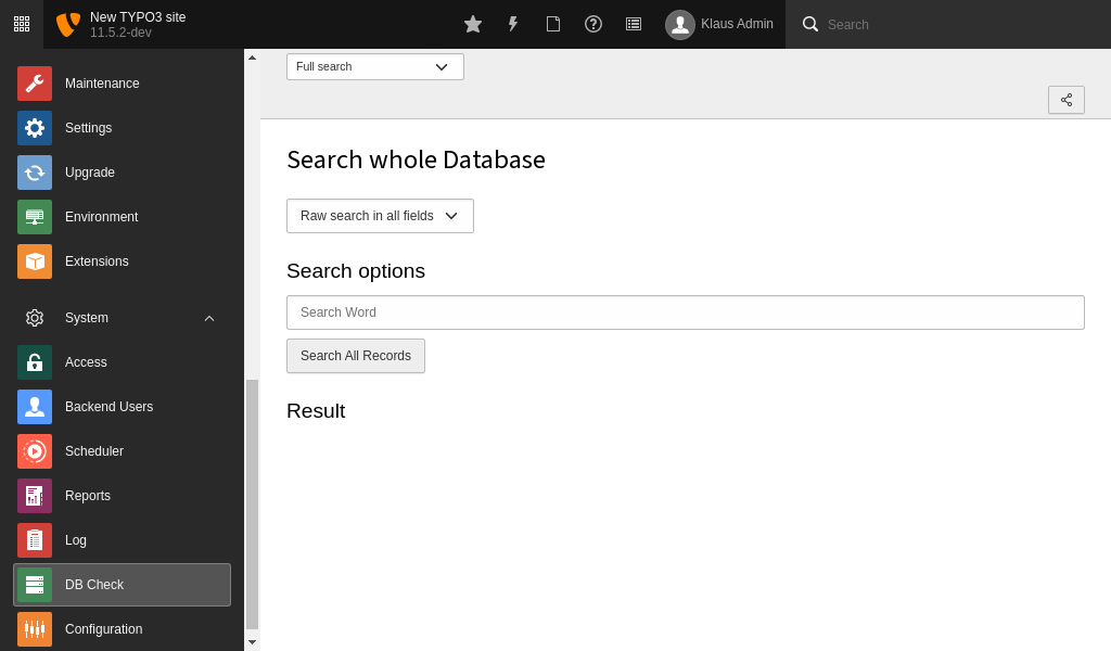 Users with administrator rights can find this module at System > Database > Full Search.