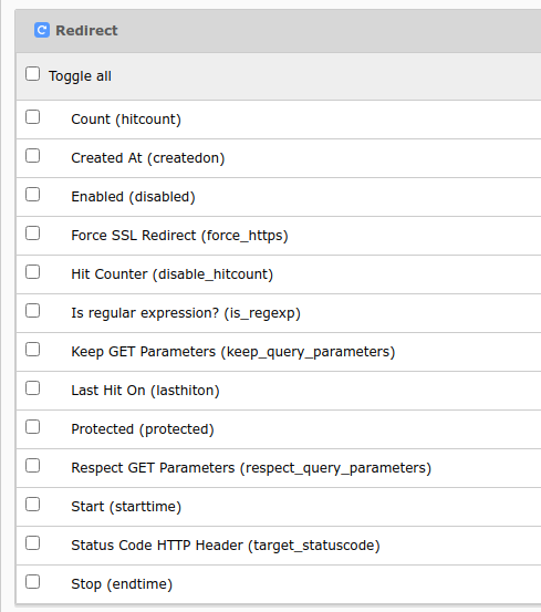 By default the fields Source Domain, Source Path and Target are enabled, the rest are excluded fields, which must be enabled for the respective backend user group in the Access Lists tab > Allowed excludefields > Redirect.