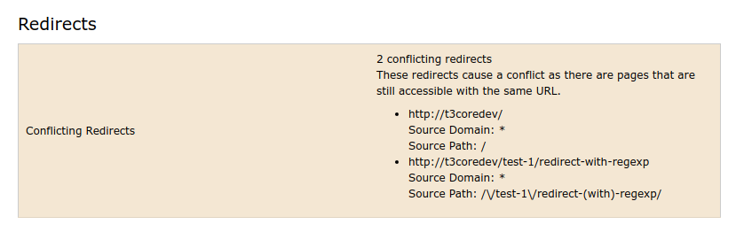 The redirect conflicts will also be shown in the system report, available via Reports > Status Report in the TYPO3 backend.