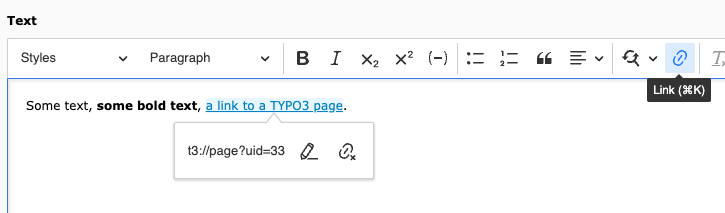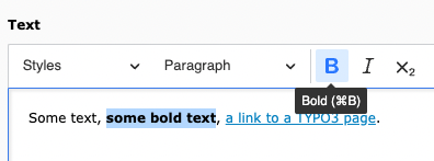 For information about working with content elements, see the section Editing content and The rich text editor in the "Tutorial for Editors".