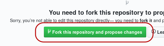 Click on the green button to fork the repository. This will clone the repository into your GitHub account, ready for you to make your changes in your browser.