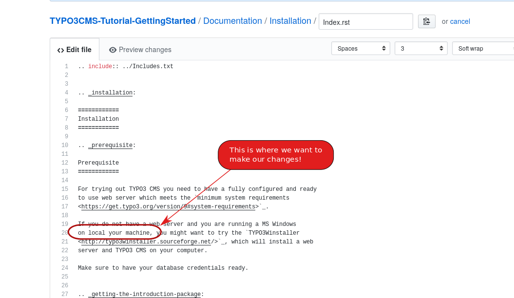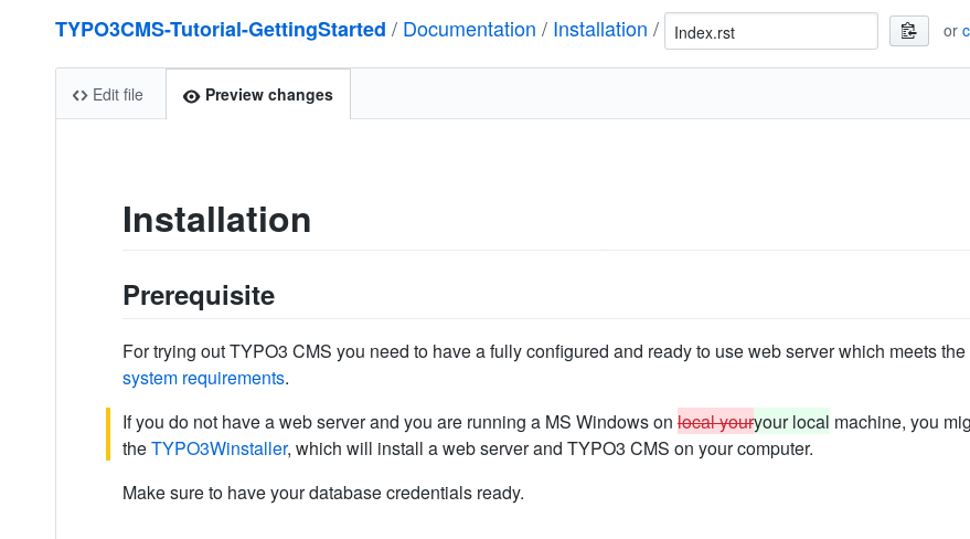 For example, you may have found a misspelling in the TYPO3 - Getting Started Tutorial or you want to add some new content to the Upgrading the TYPO3 Core and extensions.