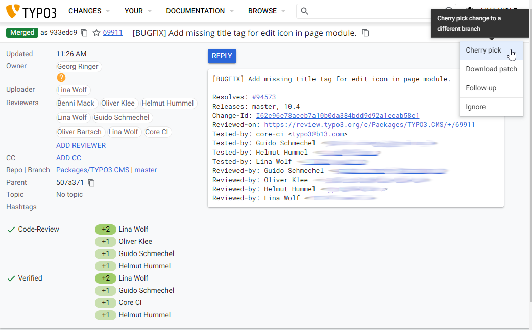 See Information: Where was a patch included? for information on how to use the Included in menu button to see, in which TYPO3 releases a patch was merged into.
