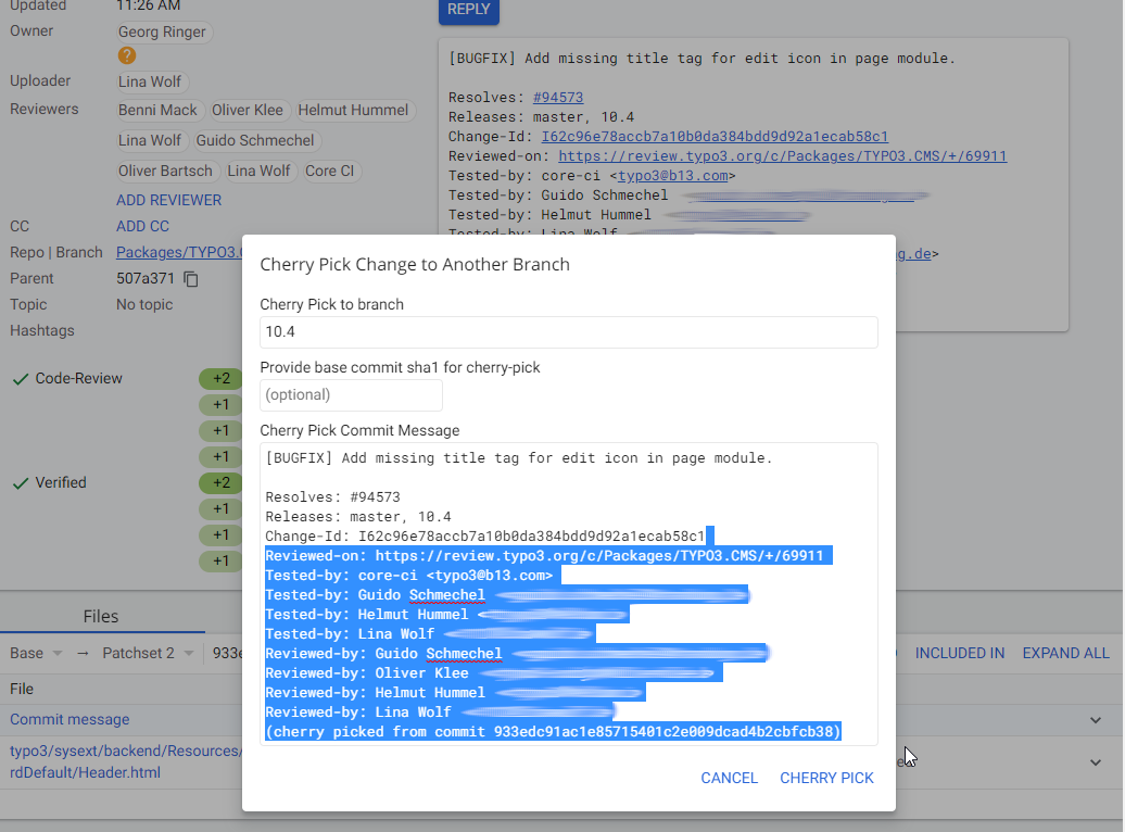 Remove from the commit message everything below the Change-ID because the information about former reviewers is not needed for the cherry pick. Make sure that you don't alter the Change-ID but remove every line (also empty ones) below it. After doing so hit the Cherry Pick button.