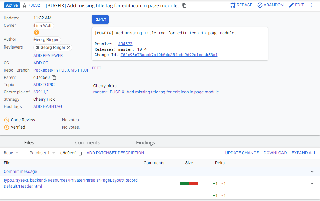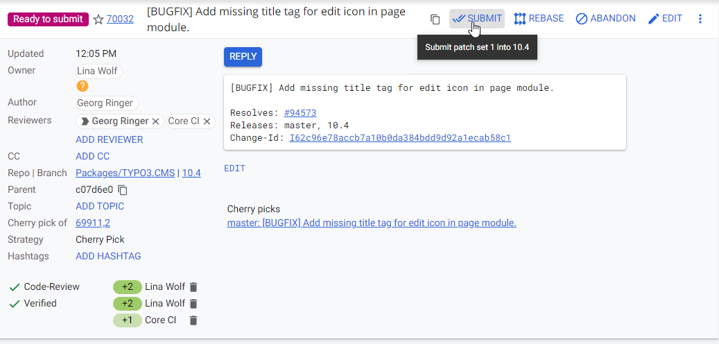 This creates a new Change on Gerrit that needs to be reviewed and merged once more.