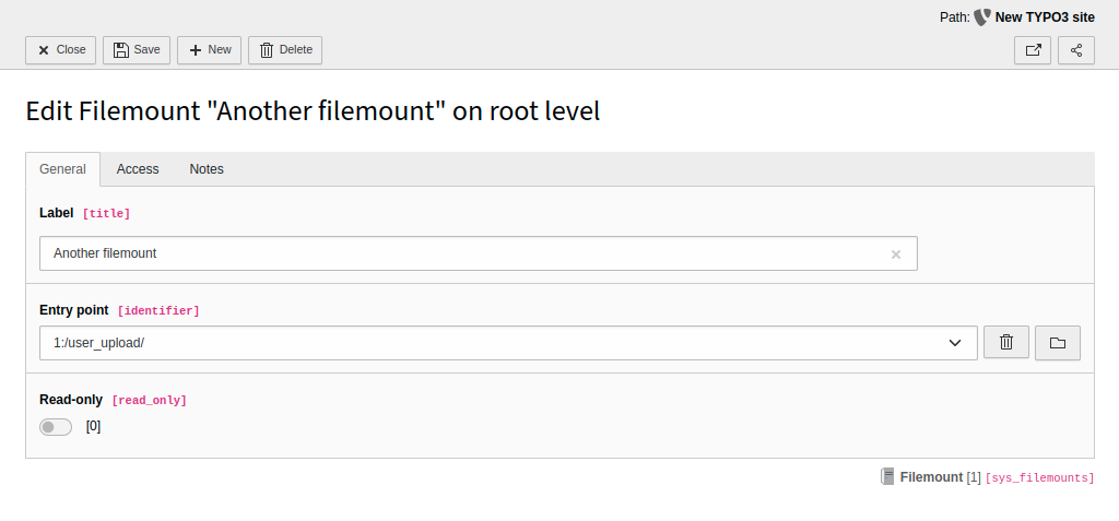 Next we can create a File Mount record (on the root page), which refers to a File Storage: