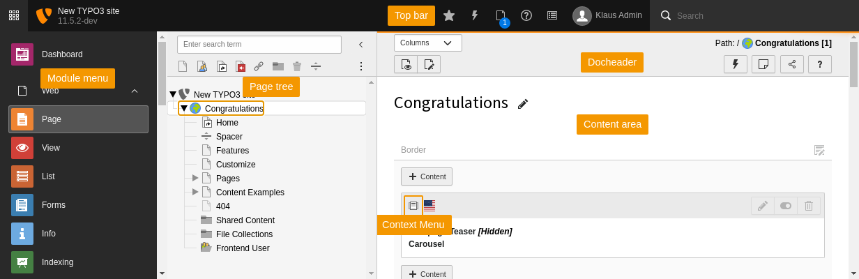$GLOBALSoption. Additional top bar tools can be registered using['TYPO3_ CONF_ VARS'] ['EXTENSIONS'] ['backend'] ['backend Logo'] $GLOBALS.['TYPO3_ CONF_ VARS'] ['BE'] ['toolbar Items'] - Module menu