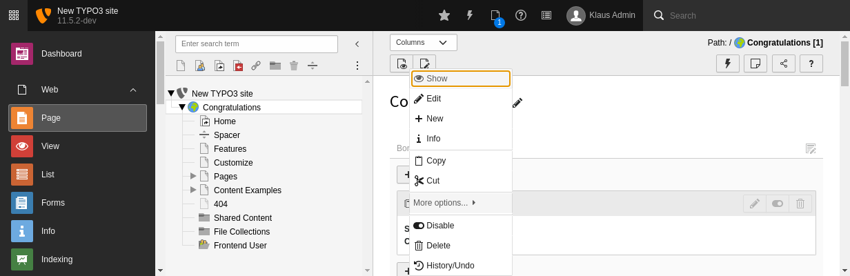 (Right) clicking on record icons will often reveal a contextual menu. New functions can be added to the contextual menus, but the mechanisms vary: the page tree behaves differently than the rest of the backend.