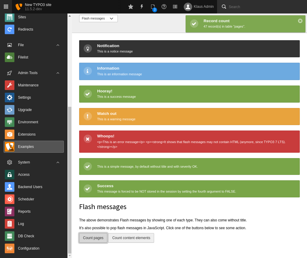 - and an additional flash message ("Record count") is rendered as top-right notification (which automatically disappear after a short delay).