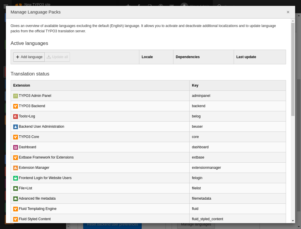 gsw_CH/setup/Resources/Private/Language/gsw_CH.locallang.xlf.gsw_CH/setup/Resources/Private/Language/gsw_CH.locallang.xlf<?xml version="1.0" encoding="UTF-8"?> <xliff xmlns="urn:oasis:names:tc:xliff:document:1.2" version="1.2"> <file source-language="en" target-language="gsw_CH" datatype="plaintext" original="EXT:setup/Resources/Private/Language/locallang.xlf"> <body> <trans-unit id="lang_gsw_CH" approved="yes"> <source>Swiss German</source> <target>Schwiizertüütsch</target> </trans-unit> </body> </file> </xliff>Copied!The custom language is now available in the user settings: