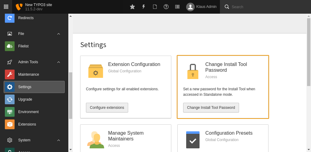 - Testing context: All backend users with administrator privileges can see the Admin Tools in the backend. However, an additional authentication step ("sudo mode") is required. The user must re-enter either their own backend password or the Install Tool password.