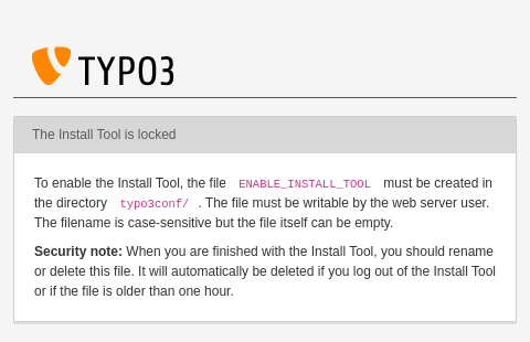 ENABLE_INSTALL_TOOLfile must exist in order for the Install Tool to be accessible. - An Install Tool password is required. This password is independent of all backend user passwords.