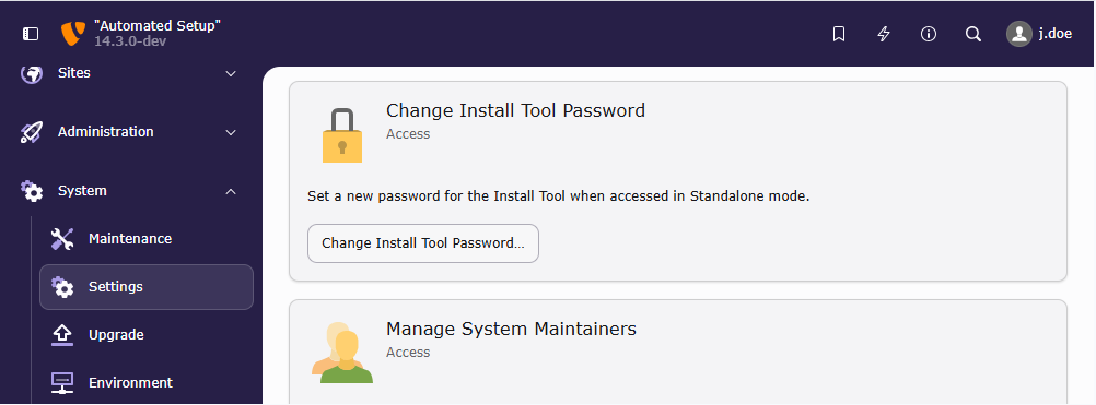 - Testing context: All backend users with administrator privileges can see the System in the backend. However, an additional authentication step ("sudo mode") is required. The user must re-enter either their own backend password or the Install Tool password.