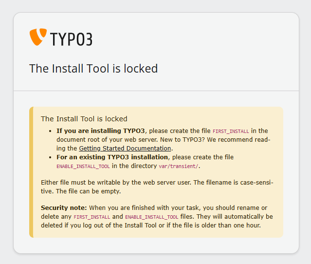 ENABLE_INSTALL_TOOLfile must exist in order for the Install Tool to be accessible. - An Install Tool password is required. This password is independent of all backend user passwords.