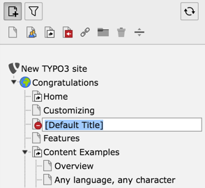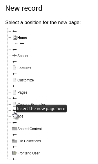 There are two ways to add a new page to your site. It can be done either by dragging the new page icon to the desired location in the page tree or by right-clicking on an existing page and using the contextual menu.