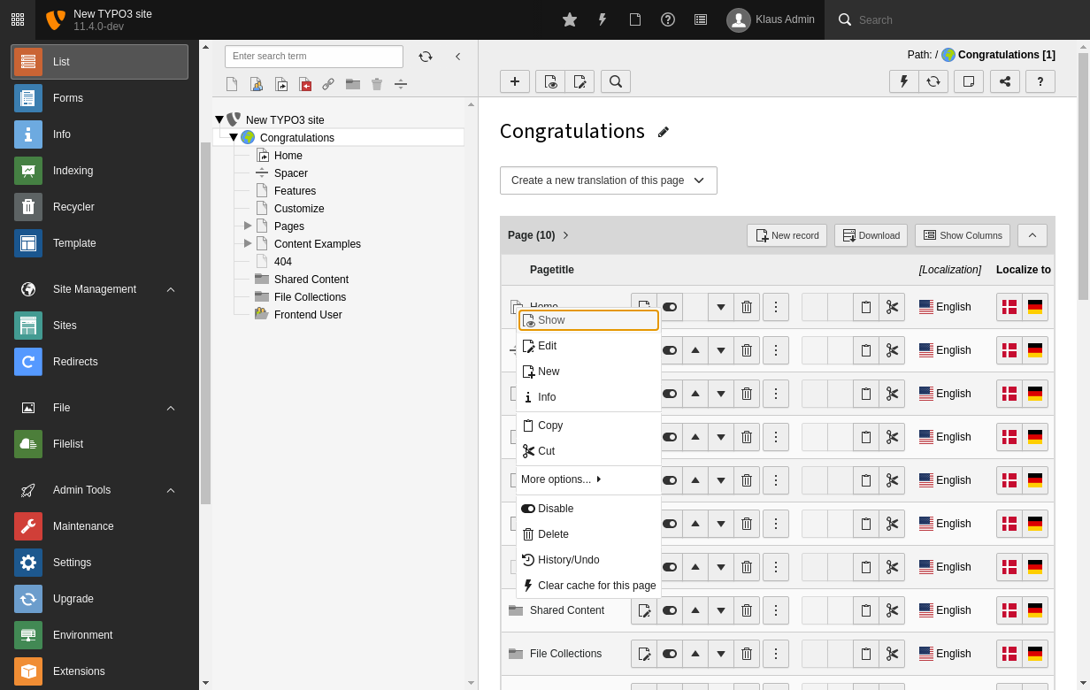 While learning about the page tree, we were introduced to contextual menus when selecting icons in the Page module.