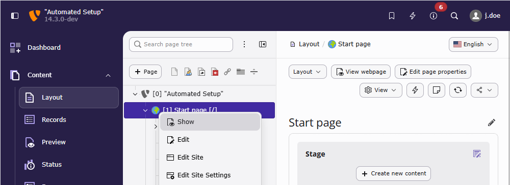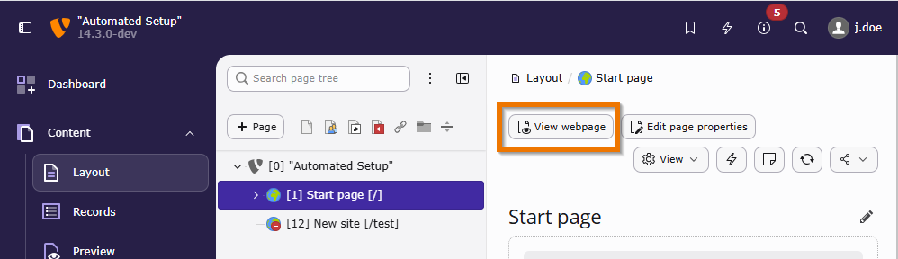 To view the page in the frontend, click on the View webpage icon in the Docheader.