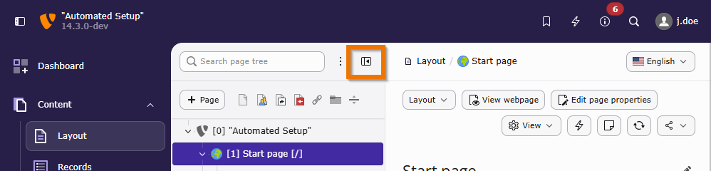 The page tree can be collapsed to gain screen space, by clicking on the second icon on the left in the top bar.