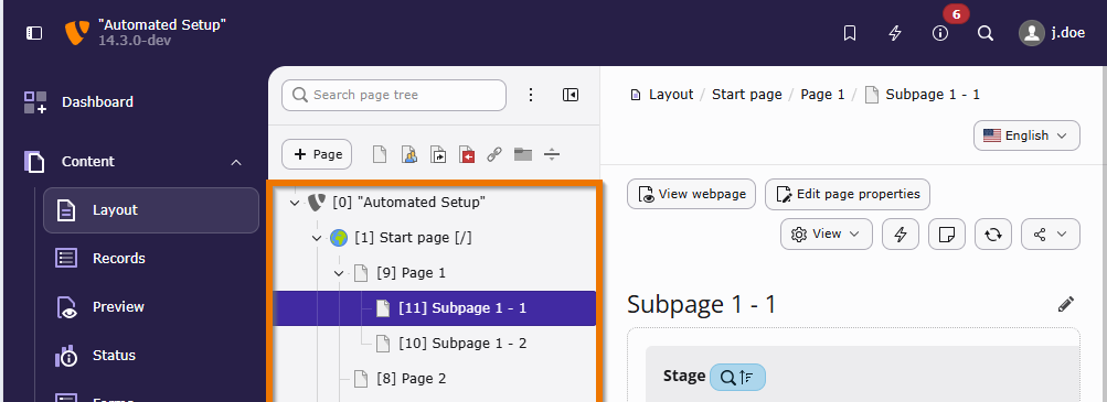 The main menu on top of your website corresponds to the first level menu pages in the page tree. The sub-menu of the "Content Examples" page in the frontend corresponds to the entries beneath "Content Examples" in the page tree.