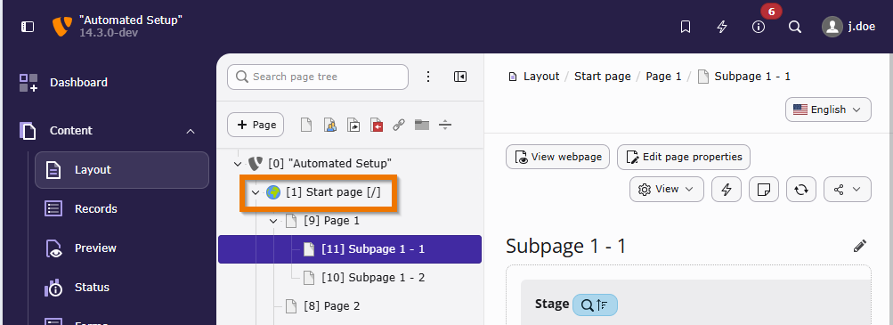 - The page with the globe icon represents the root of your website. Multiple websites can exist within a single installation of TYPO3. The top node with the TYPO3 logo is a special container which is used to store shared resources such as file mounts and backend user records.