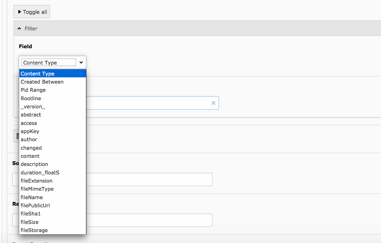 This flexform element allows you to define custom filters by selecting a Solr field and a value: