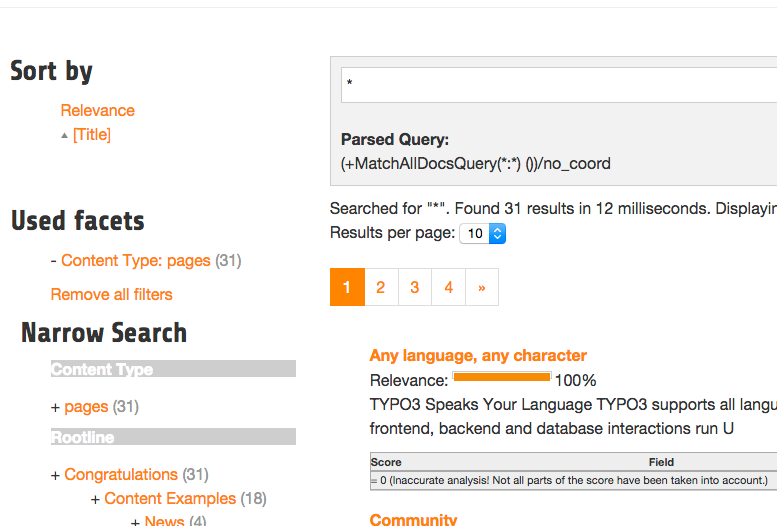 With the configuration above the possibility to sort by title is introduced. At the same time the sort by relevance link can be used to reset the sorting to sort by the natural Solr relevance.