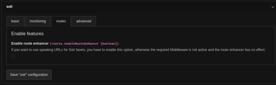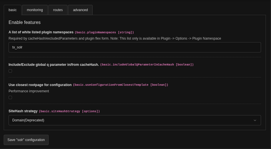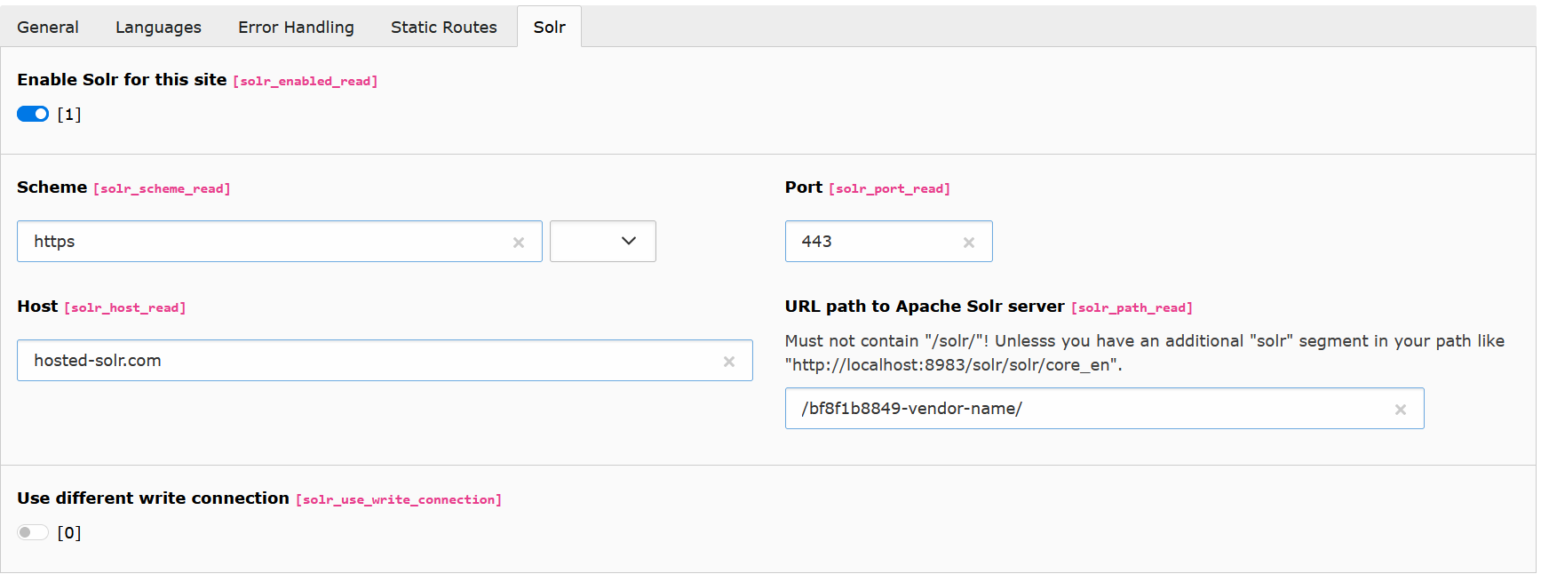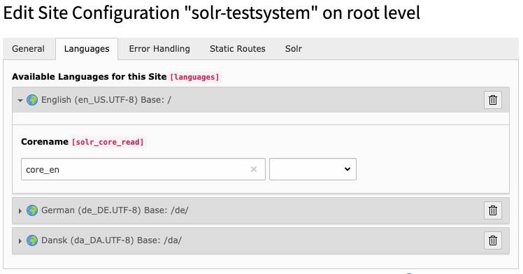 All in sites config.yaml global defined thing for EXT:solr can be configured for each language differently by editing this file manually.