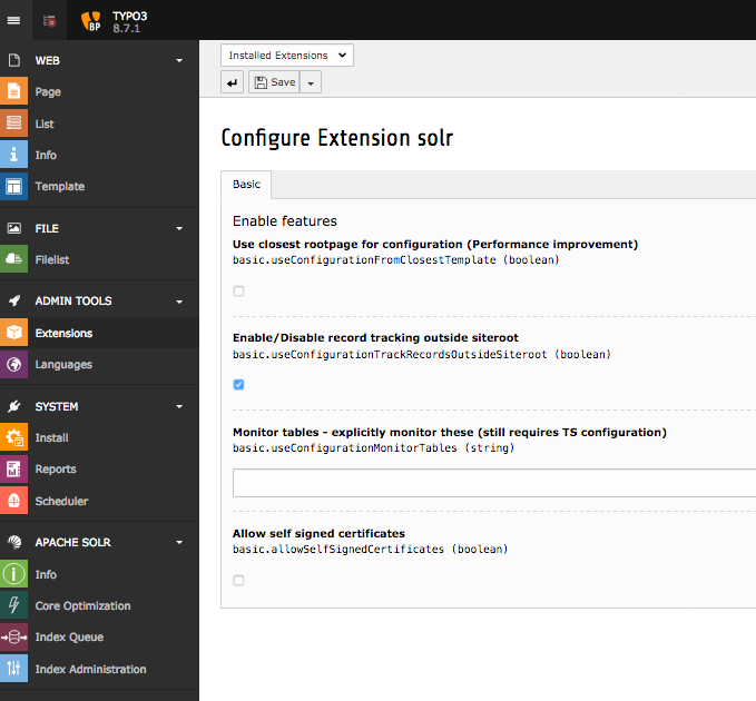 - The Solr fields are configured in 'plugin.tx_solr.index.queue.[configName].fields'. This allows you to flexibly fill any Solr field. The combination of dynamic fields (Appendix - Dynamic Fields) and the queue configuration allows you to write any kind of data into Solr without adapting the Solr schema.