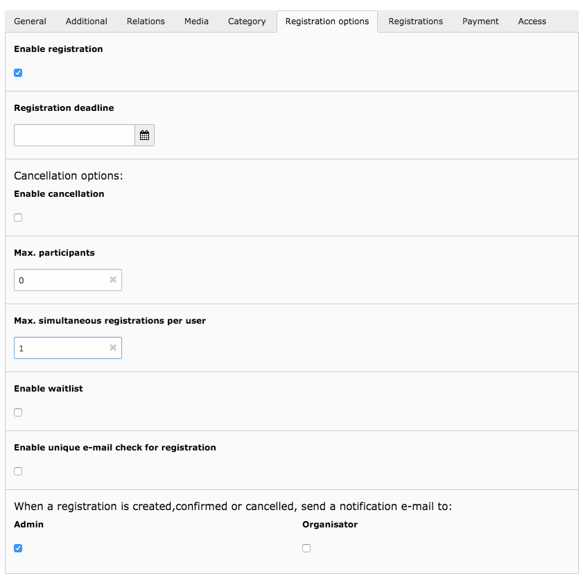 Notify admin When enabled, the administrator will receive an email for new event registrations (create/confirm)