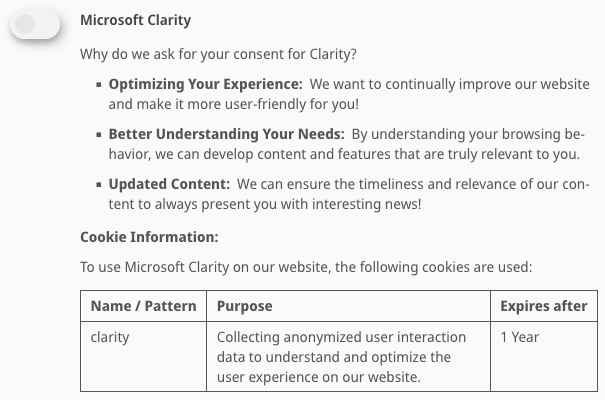 In addition to the description text of a service, all relevant cookie information is automatically displayed in a table. This is achieved by Klaro automatically enriching the description label of the service via the Fluid file EXT:.