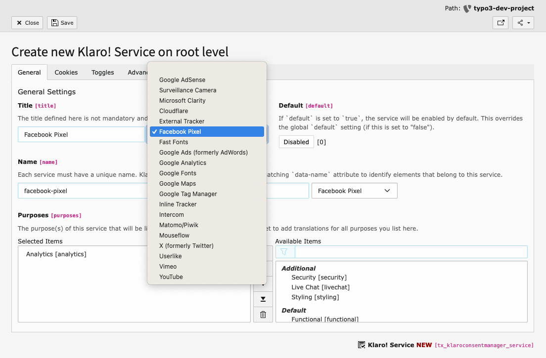 Most common services that require consent, such as Google Analytics, Matomo, Facebook Pixel or YouTube, are already covered via preconfigured presets. In these cases, you only have to select the preset and you can use the description texts that have already been prepared.