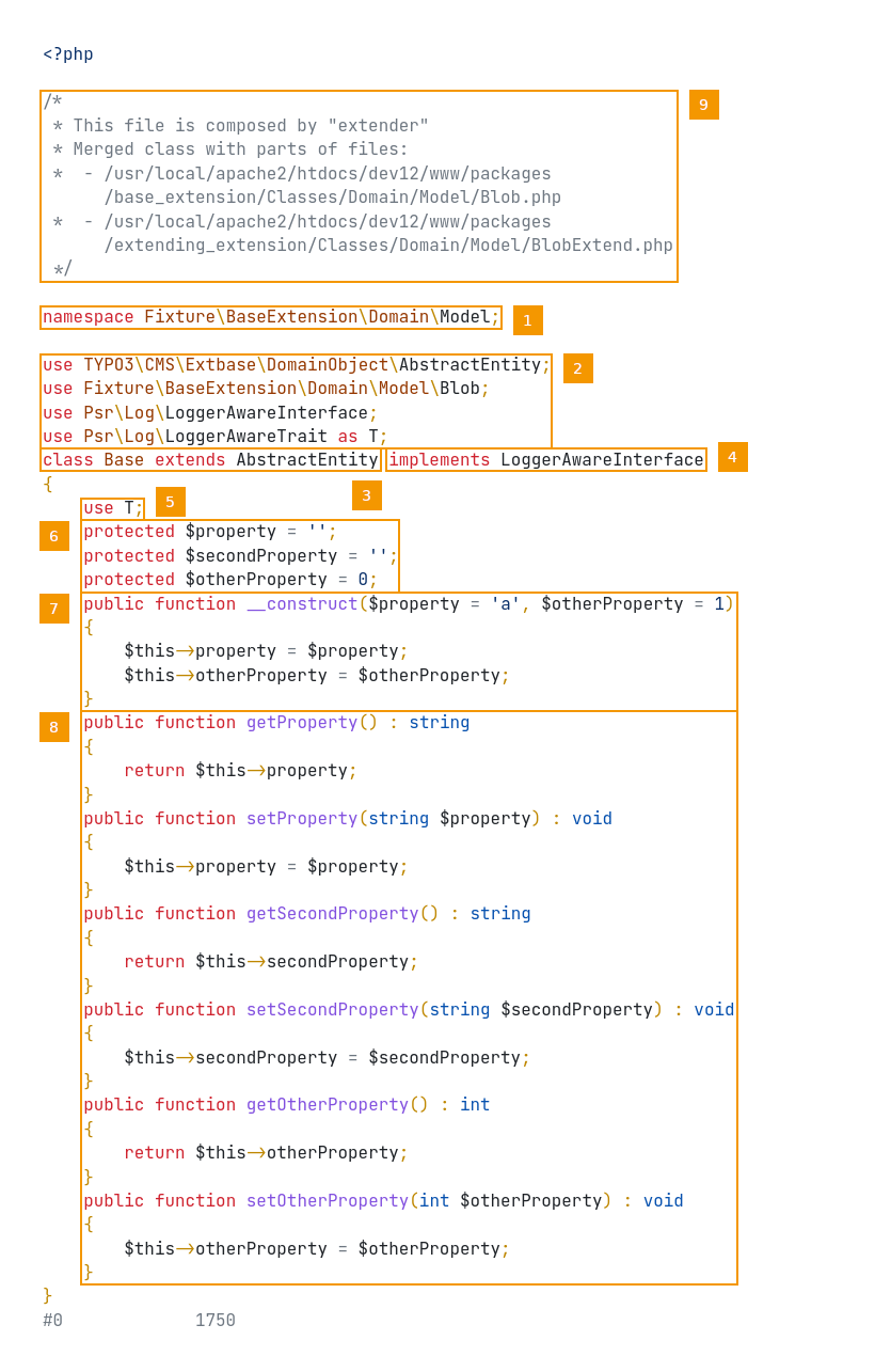 The extend file content is derived from EXT:extender/Tests/Fixtures/Extensions/extending_extension/Classes/Domain/Model/BlobExtend.php