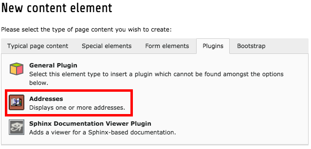 Go to the page view and navigate to the page where you want to insert one or more addresses. Create a new content element and in the “new content element wizard” scroll down to the plugins section and select "Address Selection"
