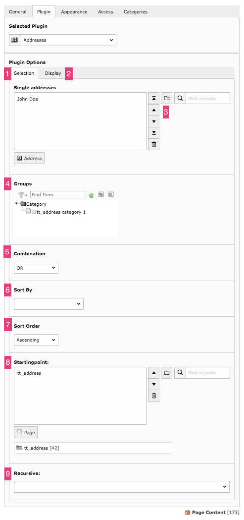 The starting point [8] does not necessarily need to be set. The extension can be configured to work with a default setting which needs to be adjusted by your administrator. If you set a startingpoint here, it will override that default setting that might be set. The recursive field [9] sets how deep in the page tree beginning from the startingpoint the system should look for addresses with the given groups.