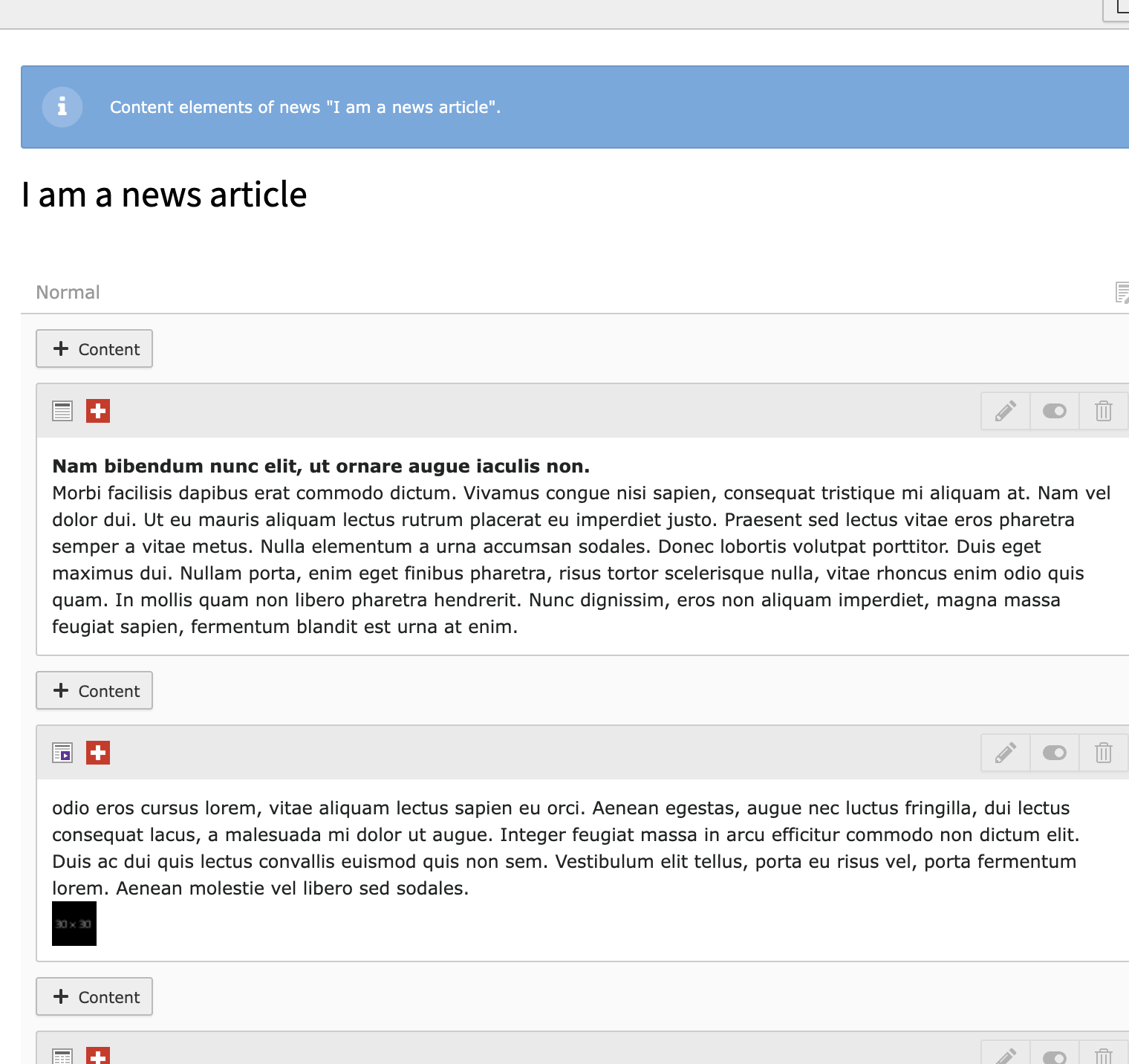 Extending a news record by additional content elements makes it possible to enrich an article by any content elements. The only drawback is that the management of those is kind of limited because of using the so called IRRE - inline record rendering type.
