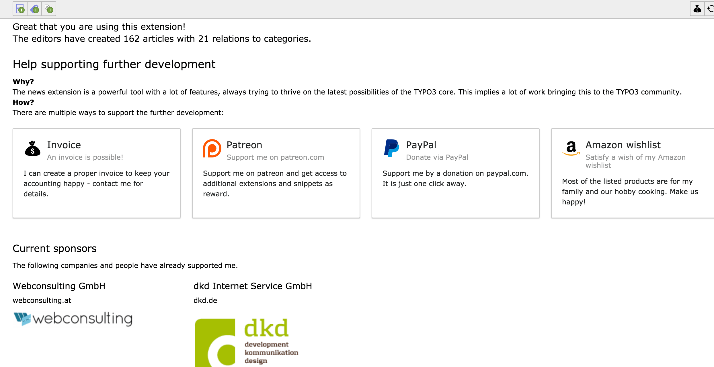 A new view has been added to the administration module to show how you can support the further development of this extension.