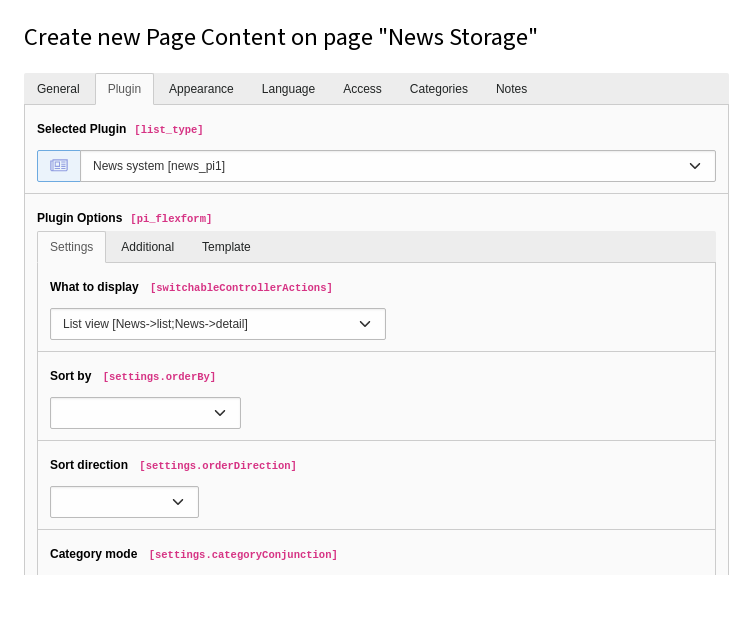 Switch to tab Additional and fill the field PageId for single news display with the page you just created before.