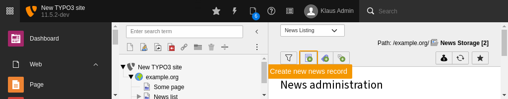 - Use the icon in the topbar Create new record and select the entry News.