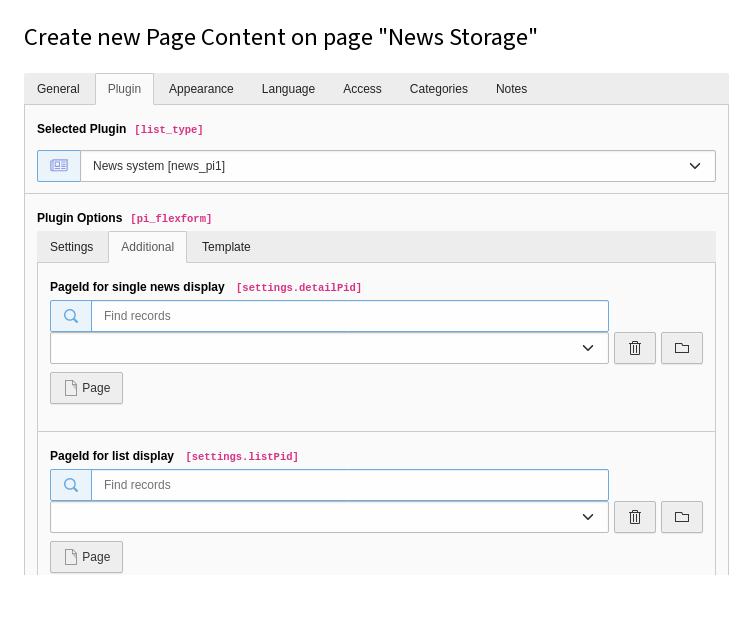 Switch to tab Additional and fill the field PageId for single news display with the page you just created before.