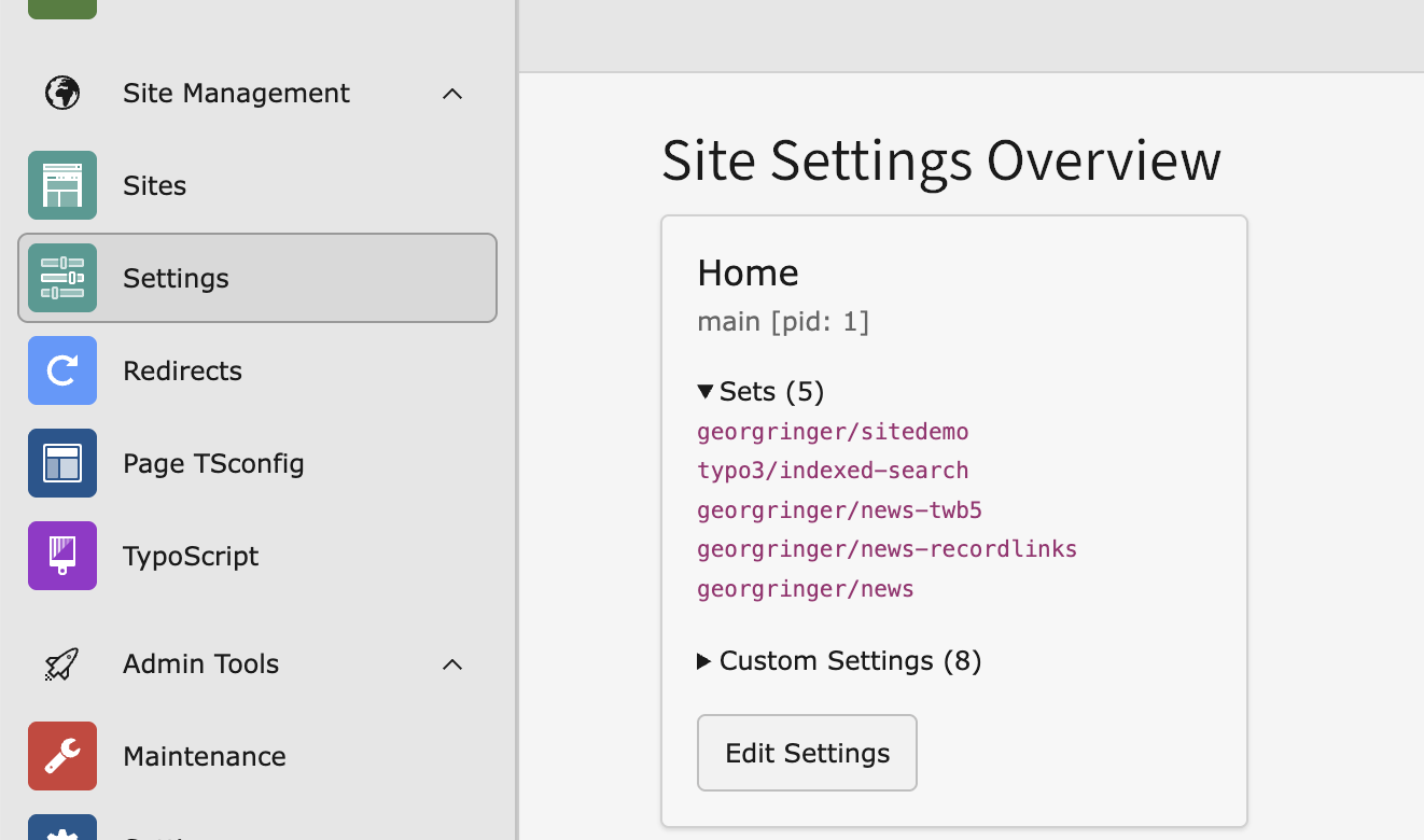 After saving, you can switch to the backend module Site Management > Settings to adopt the configurations.