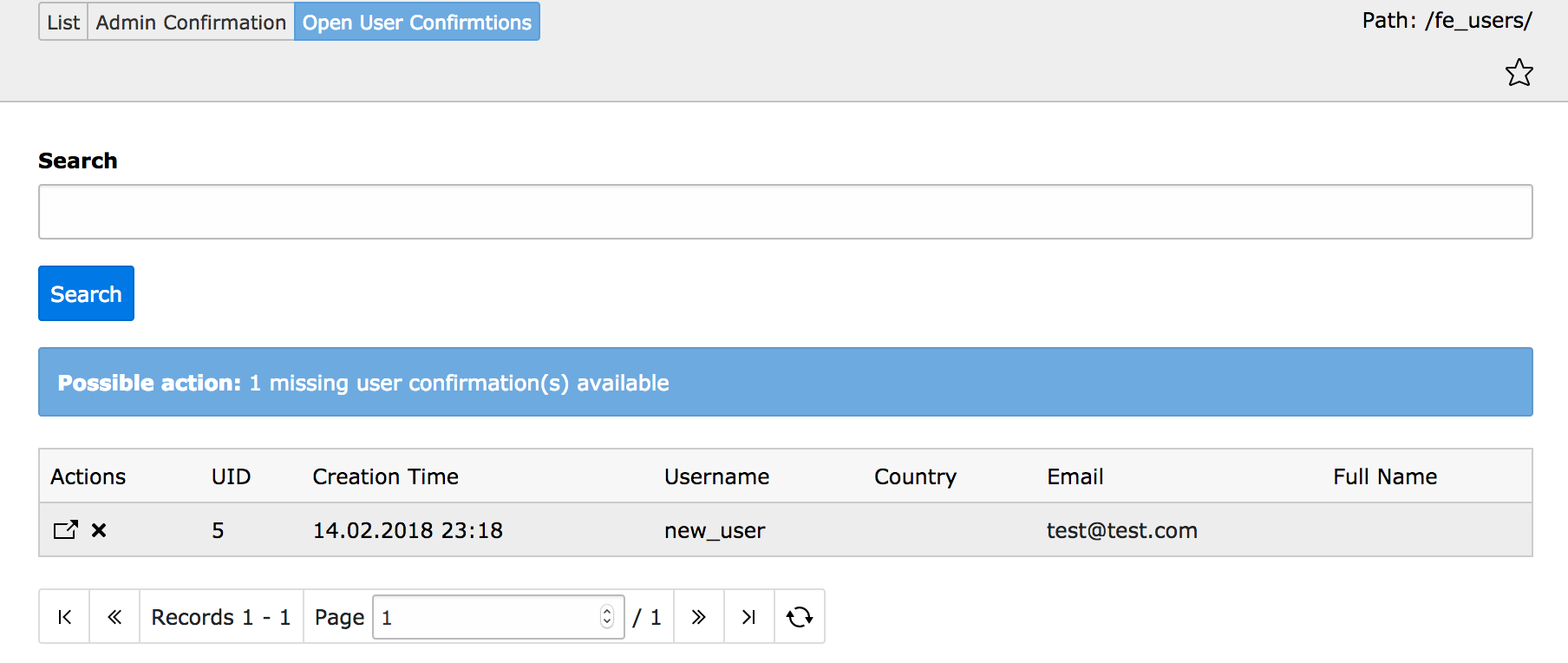 Lists all frontend users, which did not confirm their email so far. An admin is able to decline (delete) users or resend an email with a confirmation link.