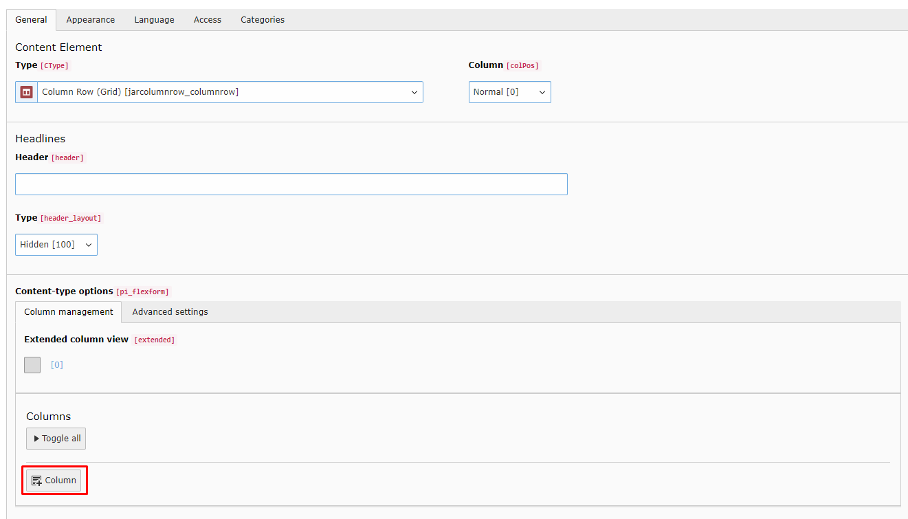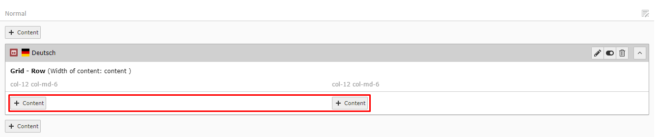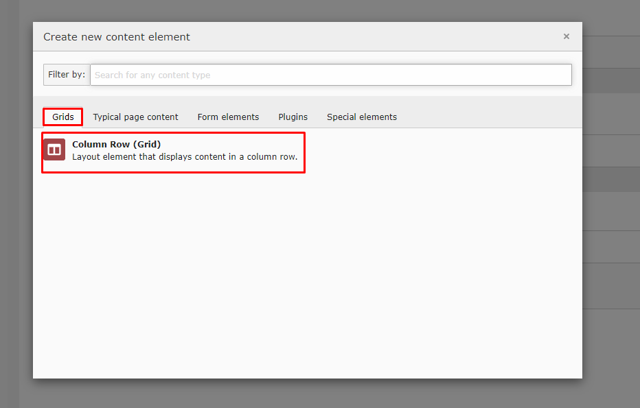 Navigate to a page with the page module enabled and add a new content element. |Choose "Column Row" in the new tab "Grids".