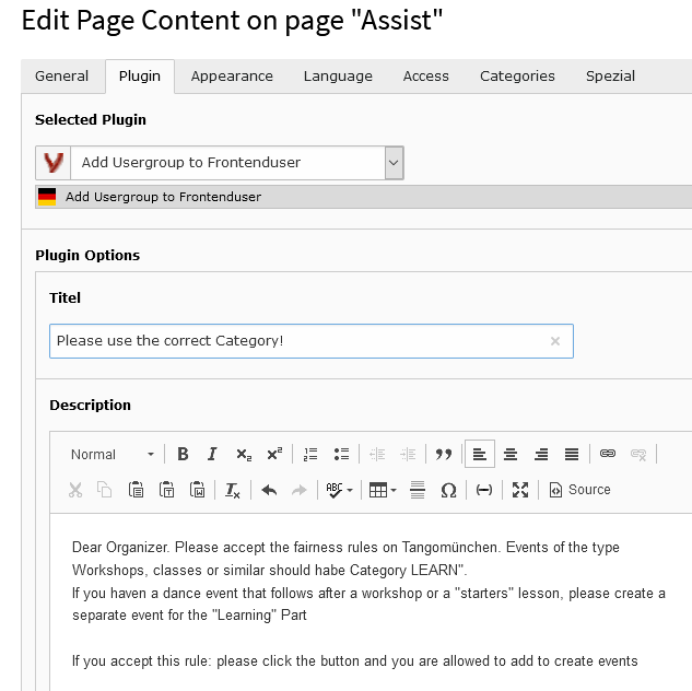Result in Frontend will be a bootstrap alert div with alert-warning class. Only visible in this example if user has usergroup "_KategoryMogler"