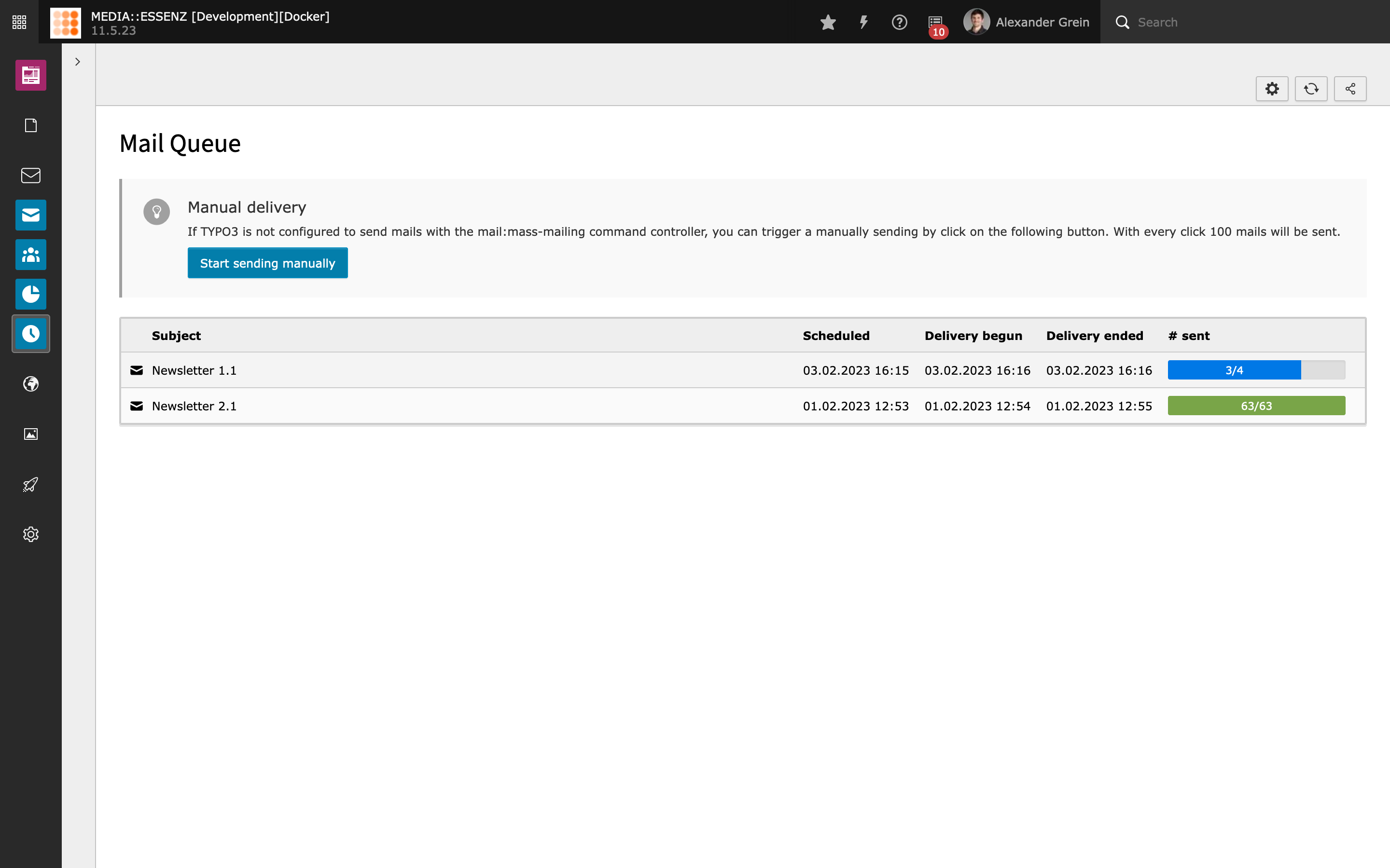 In case you did not have configured the MAIL sending queue command controller inside the TYPO3 scheduler module yet, you can press the button "Start sending manually" for now.