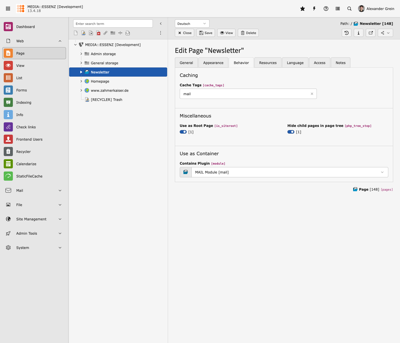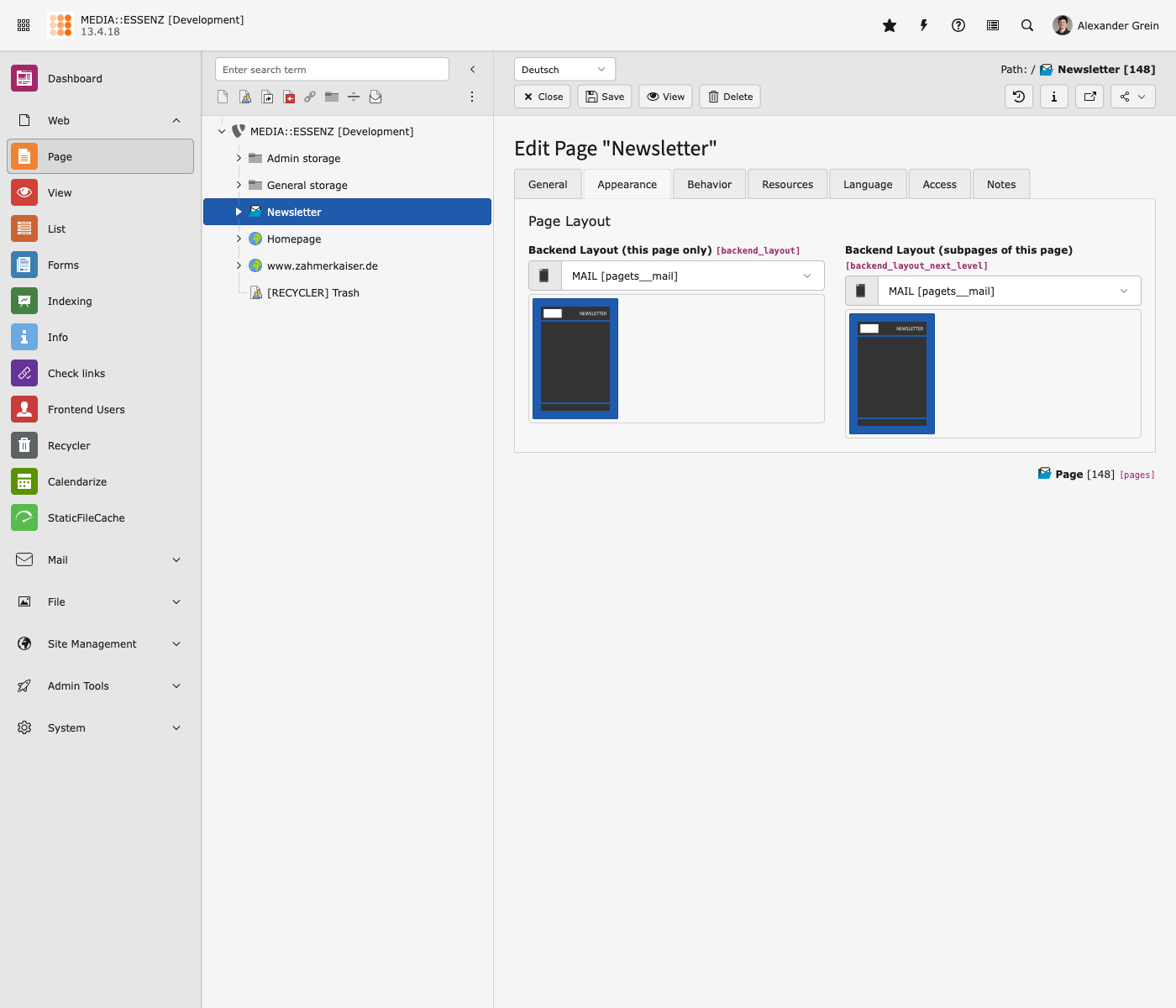 Back in the TYPO3 Page Module, open the Settings of your MAIL Root Page. In here, click on the Appearance tab, select MAIL in both Backend Layout boxes and press Save.